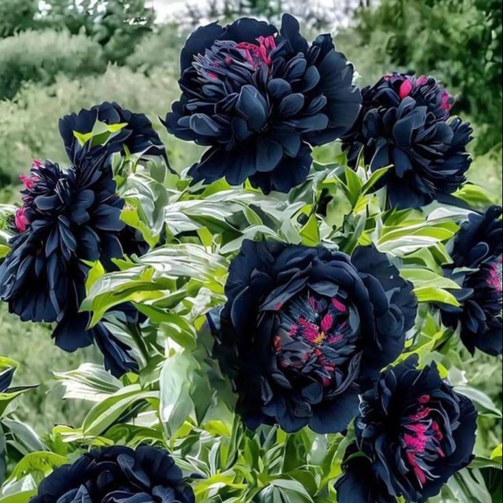 - Цвет: Главная особенность этого пиона — его уникальный цвет. Лепестки имеют глубокий чёрный оттенок, который при определённом освещении кажется почти бархатным. Сердцевина цветка ярко-красная, создавая эффектный контраст и придавая цветку чувственности и страсти.
